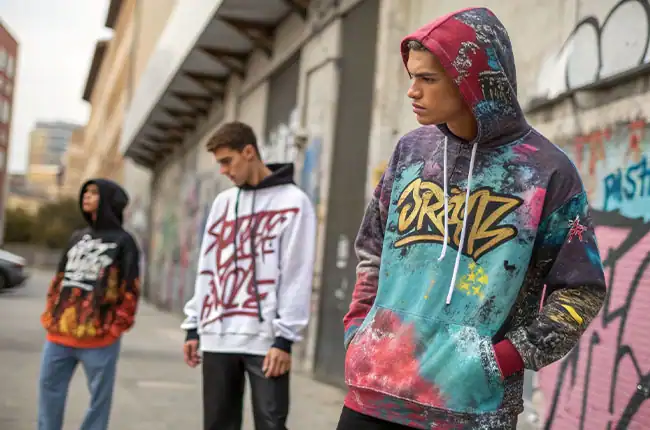 Oversized, cropped, or high-neck hoodies crafted for bold graffiti prints and street art graphics.