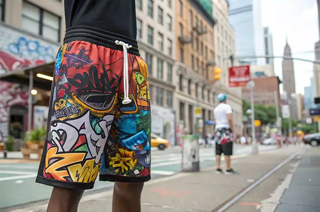 Casual or athletic-style shorts with graffiti patterns, lightweight yet perfect for urban summer collections.